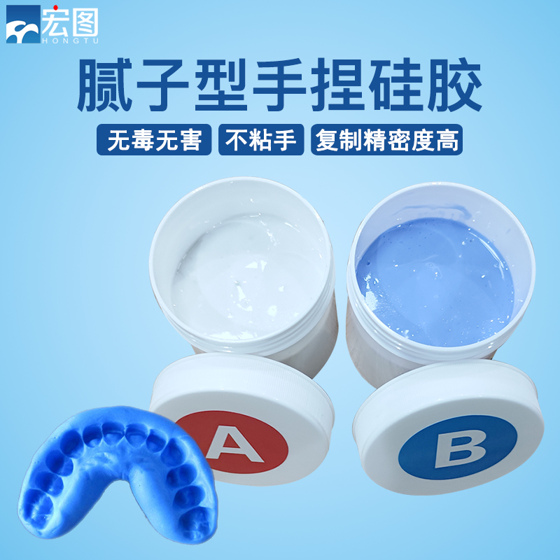 手捏硅膠是雙組份室溫固化硅橡膠,固化前A,B組分為膩?zhàn)有停ㄜ浤酄睿?,混合后可快速固化,固化后具有一定的彈性和硬度,并且具有極低的成型收縮性和存儲穩(wěn)定性。利用其方便的可塑性可便捷地復(fù)制出所要空間的形態(tài),得到物體一定空間的仿制體,進(jìn)而可以測量所需部位的尺寸。對于那些難以用工具直接測量的所需部位,利用該材料能方便的完成測量。